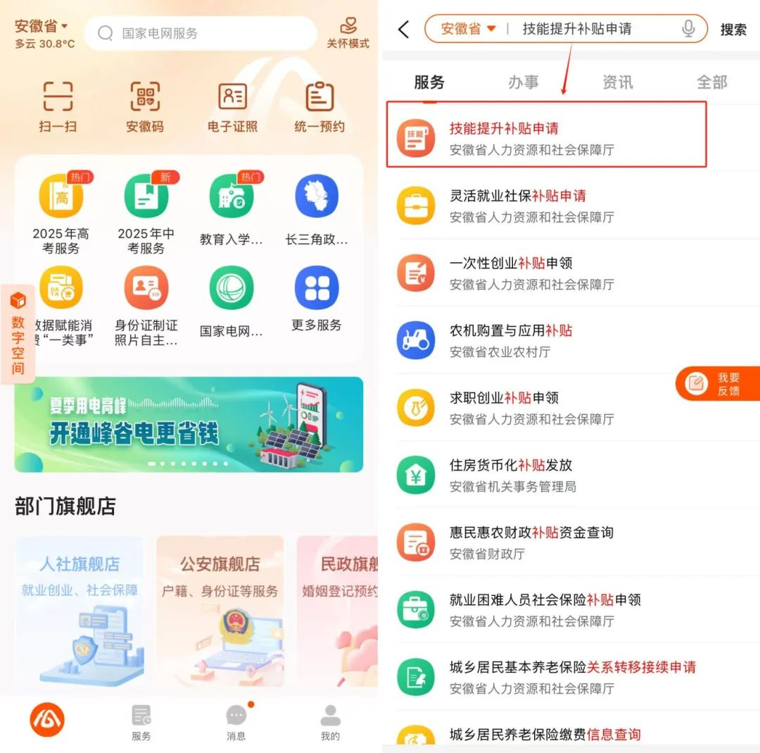 下载“皖事通”APP并注册登录,在首页搜索框搜索“技能提升补贴申请”,点击进入。