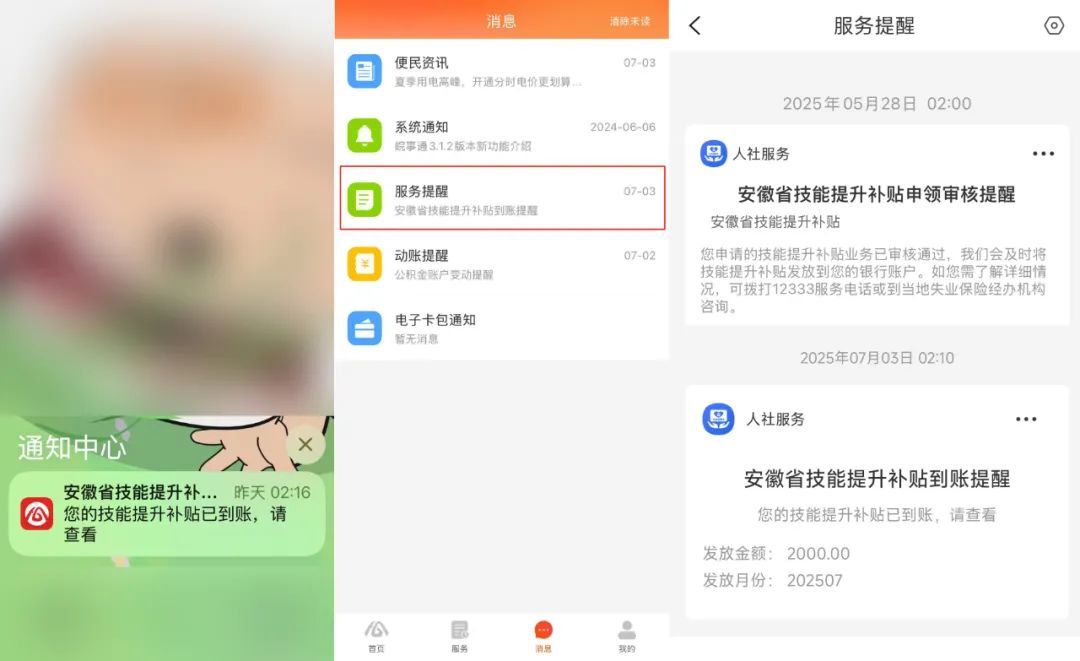 当技能提升补贴审核和发放时,系统会自动推送相关提醒,请注意查看~