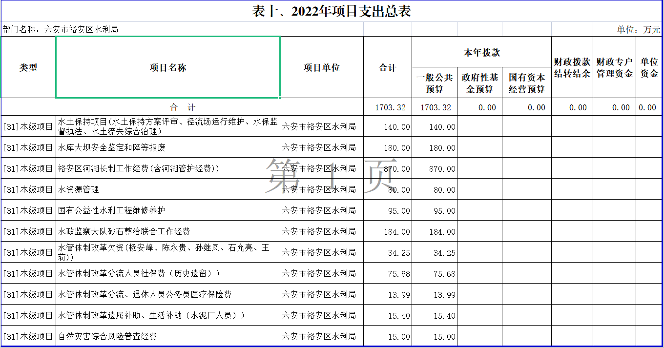 六安市裕安区水利局2022年专项资金分配结果