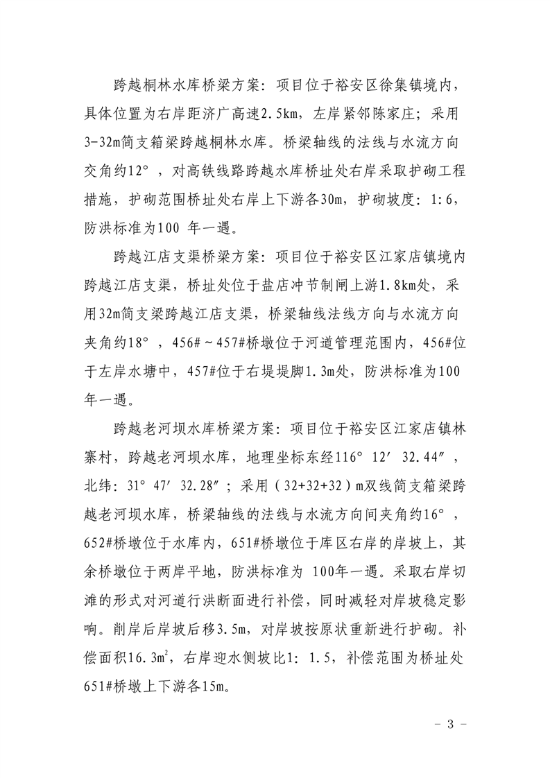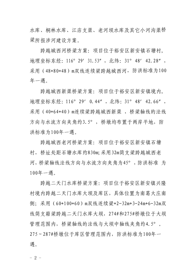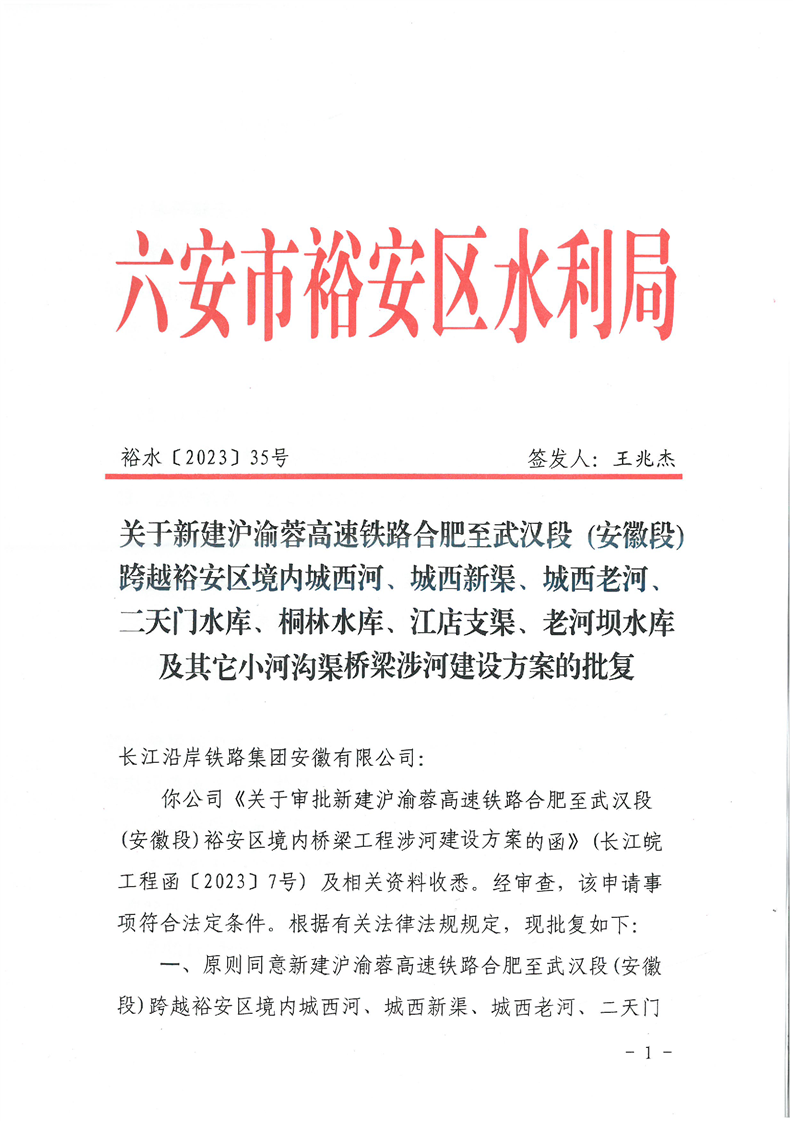 关于新建沪渝蓉高速铁路合肥至武汉段(安徽段)跨越裕安区境内城西河、城西新渠、城西老河、二天门水库、桐林水库、江店支渠、老河坝水库及其它小河沟渠桥梁涉河建设方案的批复