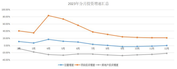 2023年,全区固定资产投资顶住房地产投资下行压力,负重前行,全年固定资产投资增长-0.3%,其中项目投资增长21.1%,房地产投资增长-22%。