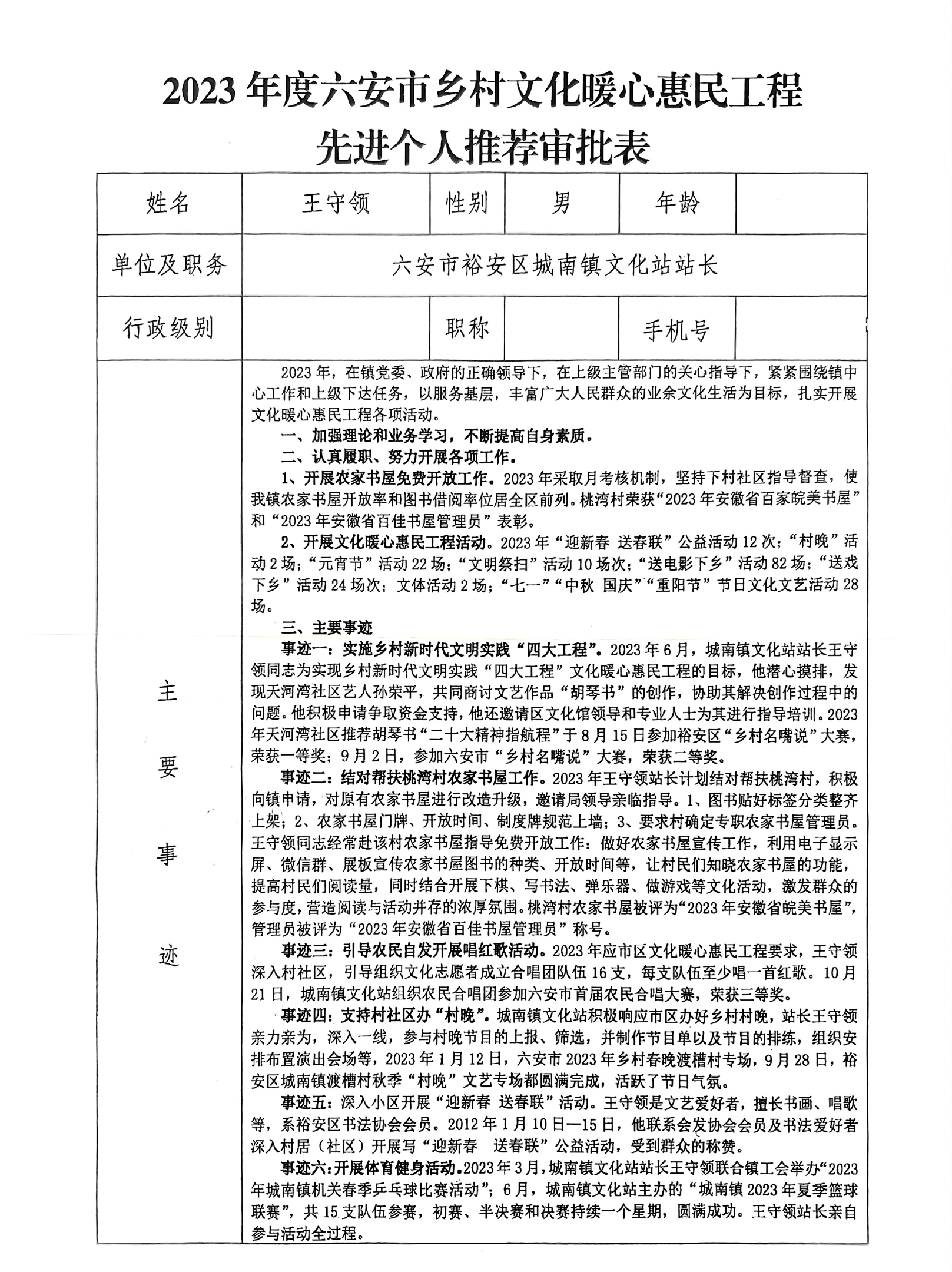 2023年度六安市乡村文化暖心惠民工程先进个人推荐审批表