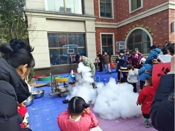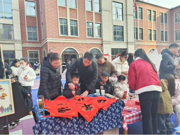 红红的灯笼高高挂起,在幼儿园的操场上,一排排集市,一个个摊位忙的热火朝天…...热乎乎的蒿子粑粑,焦黄的糖葫芦,香喷喷的爆米花、棉花糖等各种美食,空气里到处弥漫着属于冬天的人间烟火味。小朋友们吃着美食,体验着各种活动。“福”字即福气,老师手握孩子执笔,一笔一划在红红的纸上写上大大的“福”字。