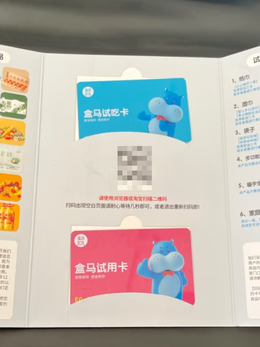 “小区每层每户的门把手上,都挂了一袋印着‘盒马鲜生超市开业大赠送’字样的宣传页。家人扫码和客服对话后,客服让下载网页链接,而不是去下载官方APP,并且立刻有异地手机号跟进指导。”近日,全国多地网友在社交平台发文,收到了“盒马鲜生”免费“试吃卡”、“试用卡”。