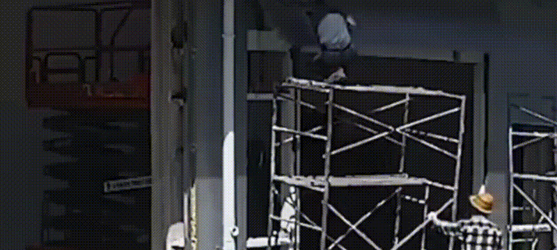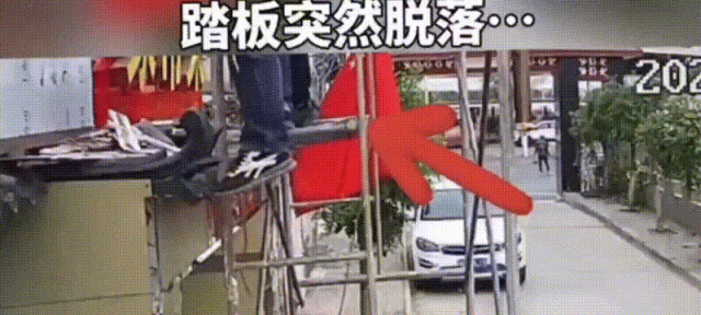 ▲一工人施工时踏板突然脱落,差点摔倒。