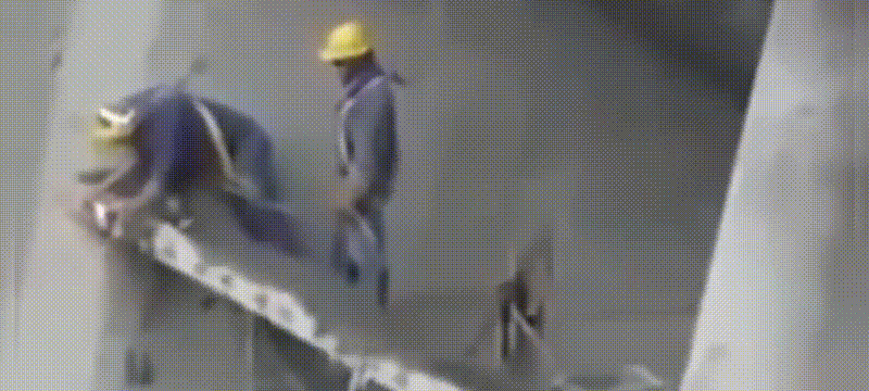 ▲ 一名工人高处作业未系安全带,事故发生时,另一名绑安全带的工人将其死死抱住救回一命。