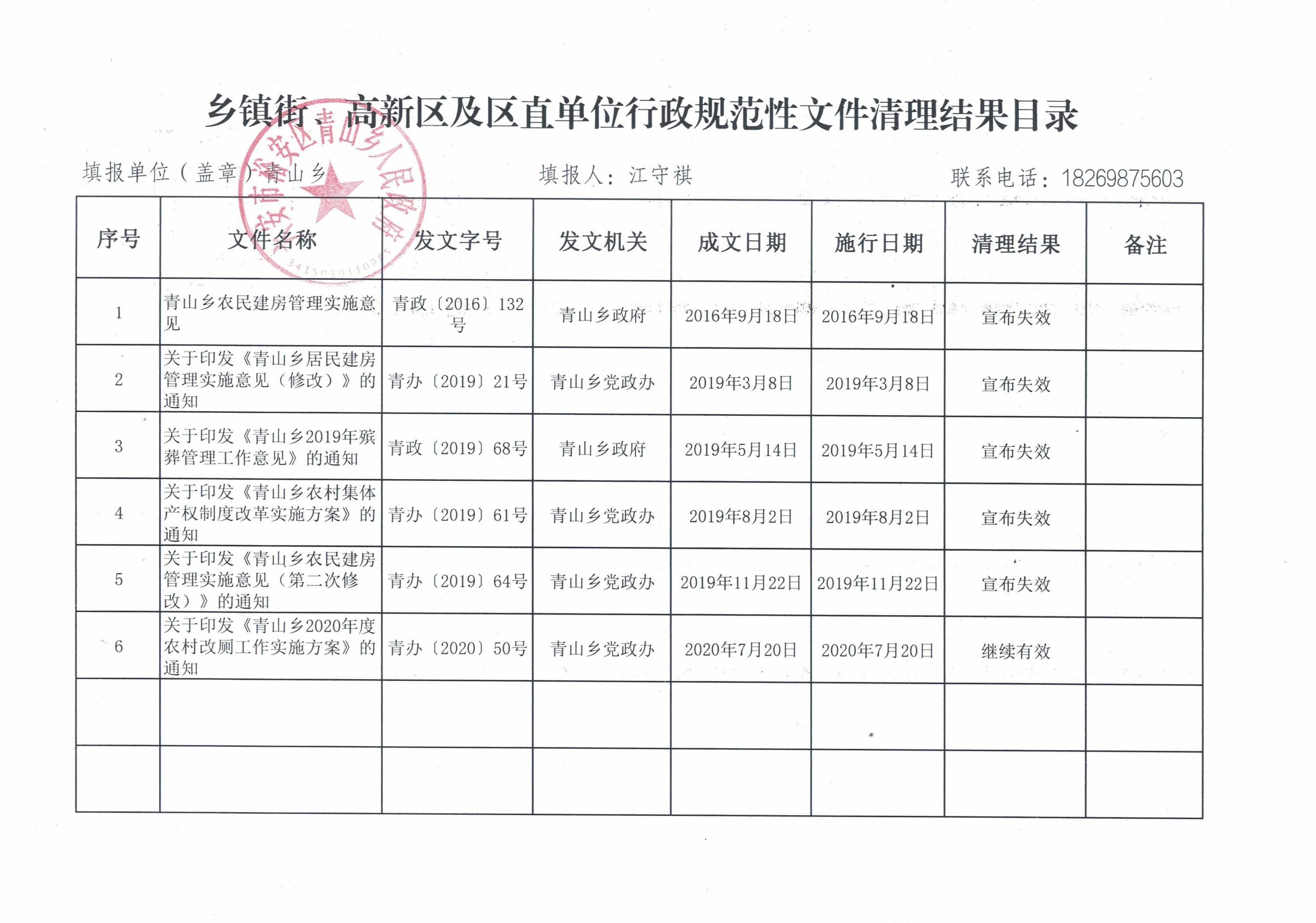裕安区青山乡2021年行政规范性文件清理结果目录