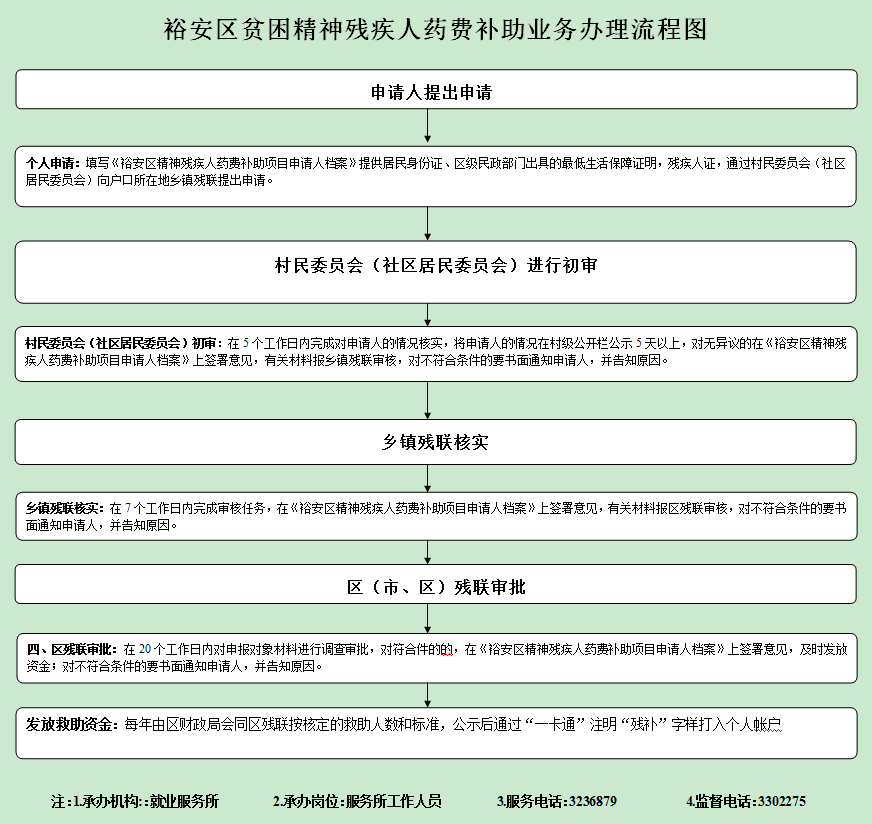 | 名 称: | 六安市裕安区贫困精神残疾人药费补助业务办理流程图 | ||