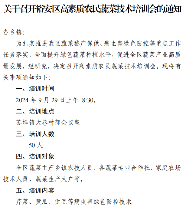 | 名 称: | 【技术培训】关于召开裕安区高素质农民蔬菜技术培训会的通知 | ||