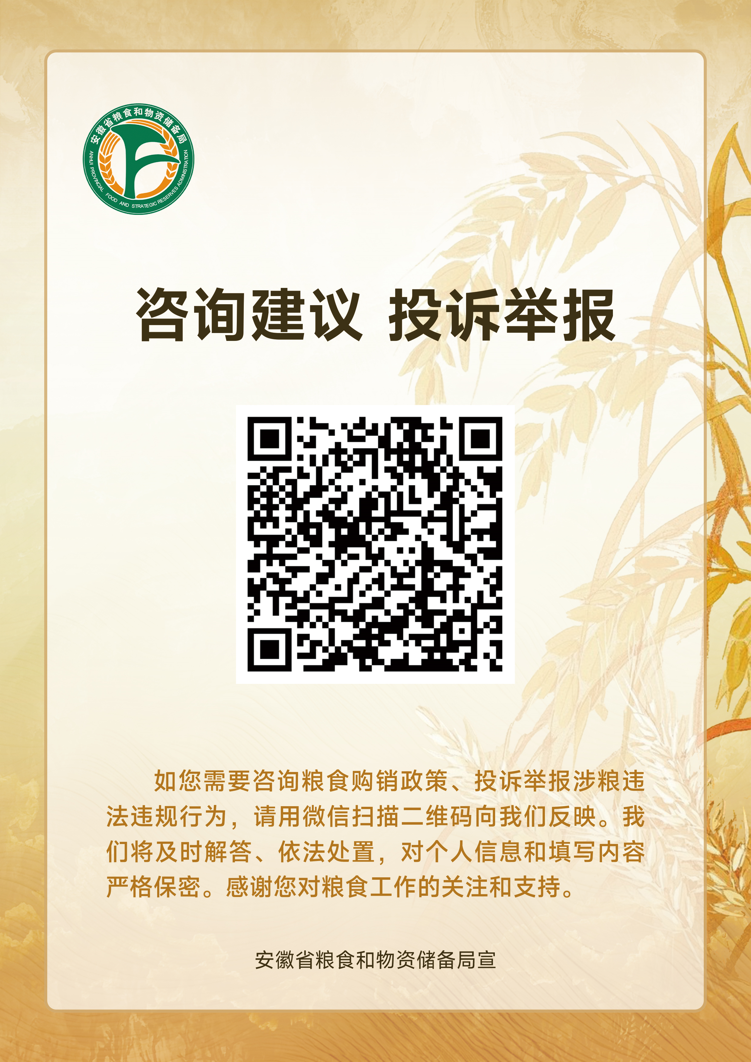 | 名 称: | 安徽省粮食和物资储备局咨询建议 投诉举报二维码 | ||