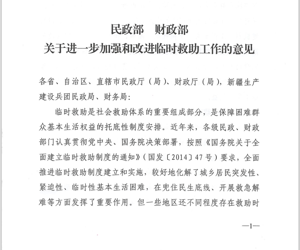 | 名 称: | 民政部 财政部 《关于进一步加强和改进临时救助工作的意见》(民发〔2018〕23号)(继续沿用) | ||