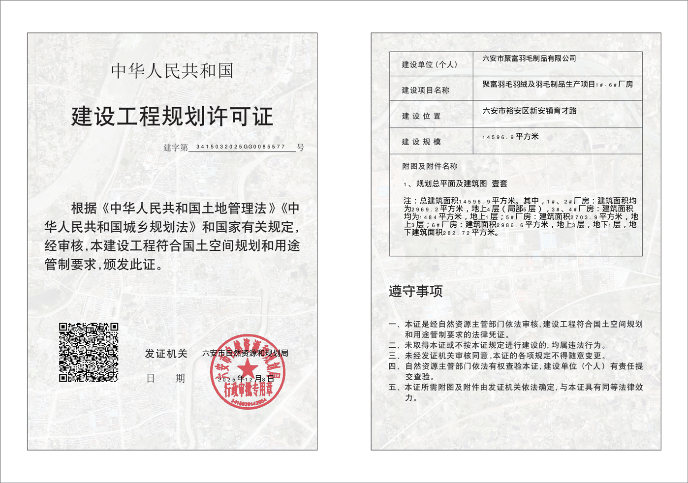 | 六安市聚富羽毛制品有限公司 | 91341503MA2WNHP43N | 张磊 | 建设工程规划许可证 | 建字第3415032025GG0085577号 | 普通 | 聚富羽毛羽绒及羽毛制品生产项目1#-6#厂房 | 2025-12-08 | 2025-12-08 | 2026-12-08 | 六安市裕安区自然资源和规划局 | 11341403003225766Q |