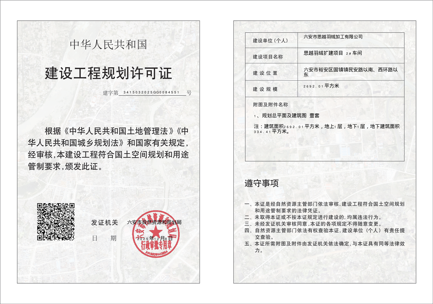 | 六安市思越羽绒加工有限公司 | 91341503MA2T79TT15 | 王友中 | 建设工程规划许可证 | 建字第3415032025GG0084551号 | 普通 | 思越羽绒扩建项目2#车间 | 2025-12-08 | 2025-12-08 | 2026-12-08 | 六安市裕安区自然资源和规划局 | 11341403003225766Q |
