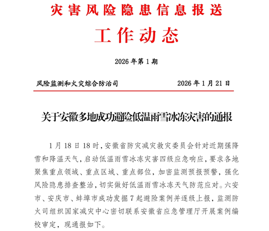 1月18日以来,安徽迎来新一轮雨雪灾害天气,多地成功避险低温雨雪冰冻灾害,其中裕安区江家店镇获得应急管理部风险监测和火灾综合防治司通报表扬,内容如下: