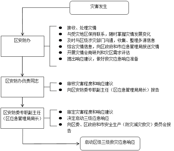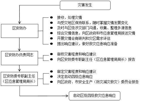 灾害发生后,区安防办经分析评估,认定灾情达到启动标准,区安防委专职副主任(区应急管理局局长)决定启动四级响应,并向区政府、市安全生产(防灾减灾救灾)委员会报告。