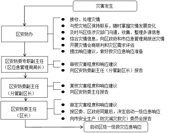 灾害发生后,区安防办经分析评估,认定灾情达到启动标准,向区安防委提出启动一级响应的建议,报区委、区政府同意后,启动一级响应,并向市安全生产(防灾减灾救灾)委员会报告。