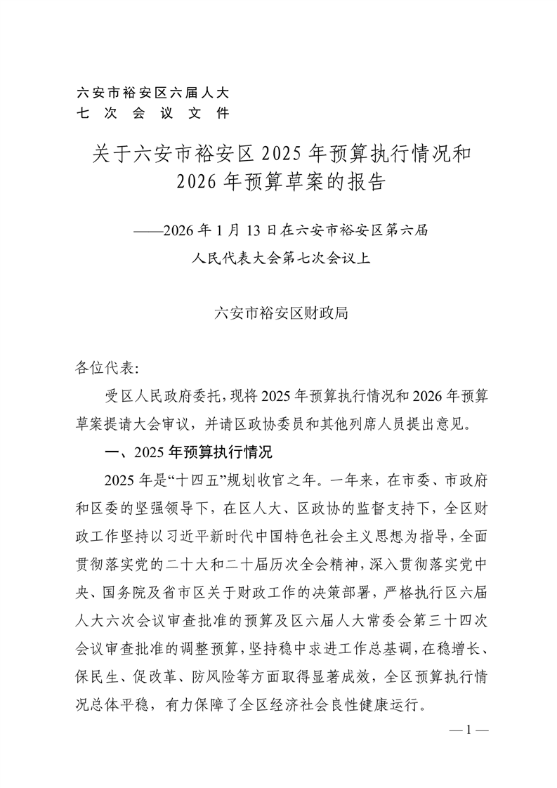 | 名 称: | 关于六安市裕安区2025年预算执行情况和2026年预算草案的报告 | ||