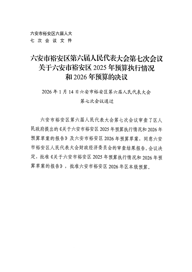 | 名 称: | 关于六安市裕安区2025年预算执行情况和2026年预算的决议 | ||
