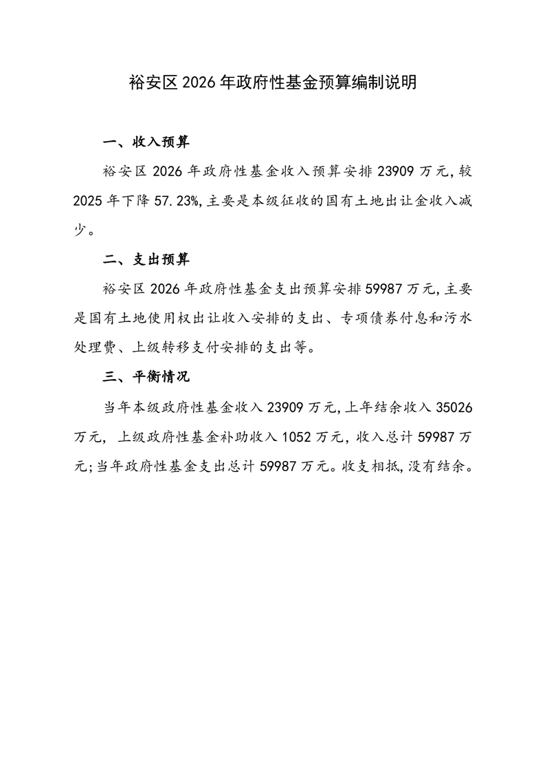 | 名 称: | 裕安区2026年政府性基金预算编制说明 | ||