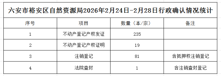 | 名 称: | 六安市裕安区自然资源和规划局不动产登记发证情况统计表(2026年2月24日-2026年2月28日) | ||