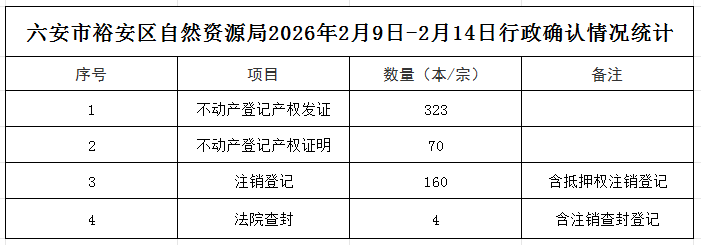 | 名 称: | 六安市裕安区自然资源和规划局不动产登记发证情况统计表(2026年2月9日-2026年2月14日) | ||