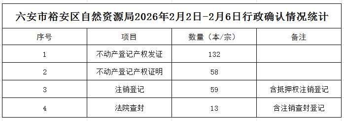 | 名 称: | 六安市裕安区自然资源和规划局不动产登记发证情况统计表(2026年2月2日-2026年2月6日) | ||