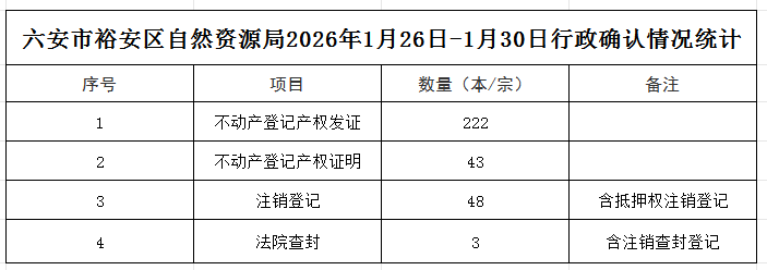 | 名 称: | 六安市裕安区自然资源和规划局不动产登记发证情况统计表(2026年1月26日-2026年1月30日) | ||