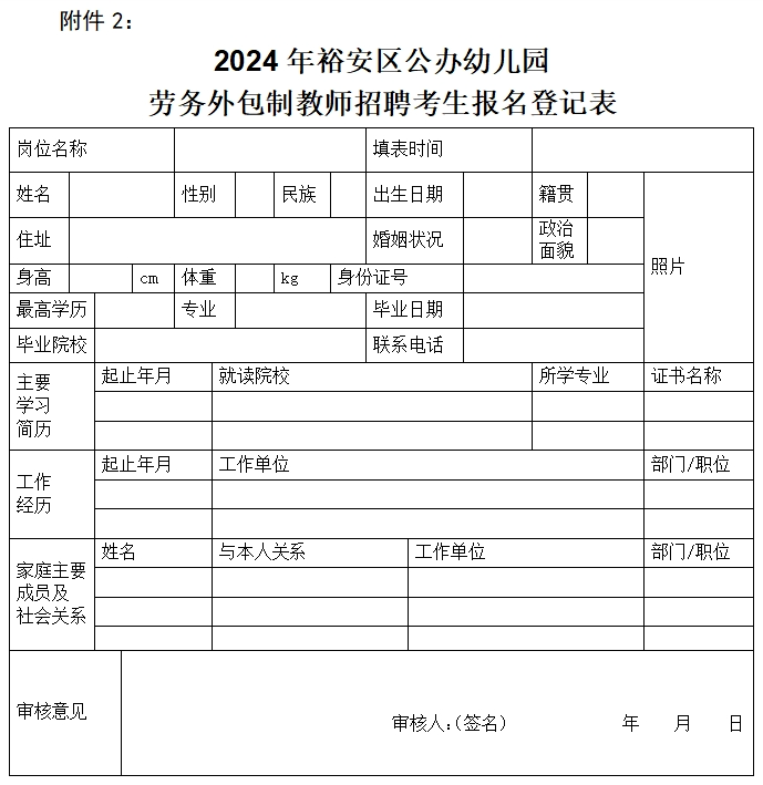 (1)本人签名确认的《2024年裕安区公办幼儿园劳务外包制教师招聘考生报名登记表》(附件2);