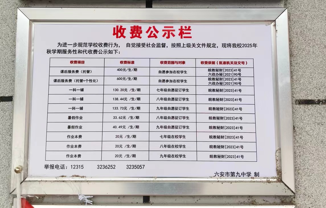 六安九中2025年秋收费项目标准依据和范围