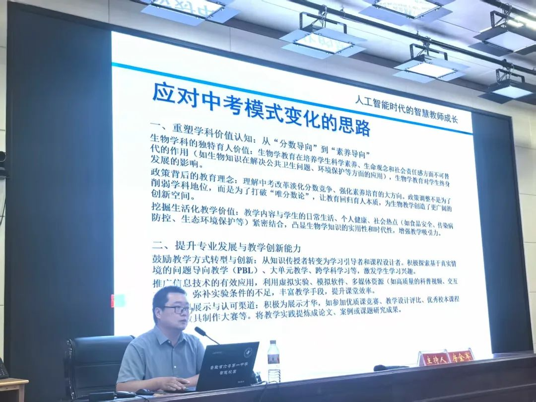 讲座1《人工智能时代的初中生物学的智慧教师的发展》 的主讲人为六安市教科院的房全军主任。房主任首先分析了2023-2025年八年级生物学学业水平考试整体情况的变化,并提出以“重塑学科价值的认知、提升专业发展与教学创新能力、加强初高中学段衔接”的新思路应对六安市中考模式变化。为了助力生物学教师在AI 时代的能力提升,应对不断变化的中考模式,房主任从“AI时代教学逻辑变革”和“AI的多场景应用与智慧教师发展”两方面,向大家展示AI 时代日新月异的变化,给生物学的教学教研工作带来的便利。最后,房主任希望全体的生物教师能利用好课余时间,多学习AI时代的新知识,让AI技术和生物学能真正地融合起来,用以提升六安市初中生物学的教学效果。