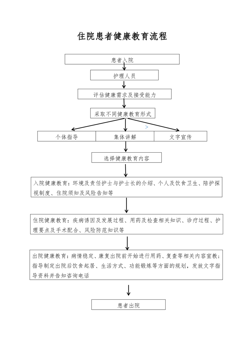 (1)各临床业务科室主任必须重视并主管住院健康教育,将此项工作纳入岗位责任制;住院区设立健康教育专栏,并经常更换宣传内容;召开医患(或家属)座谈会或咨询会,举办健康教育讲座等。督促检查医护人员对病人入院、住院和出院过程中的.健康教育工作。
