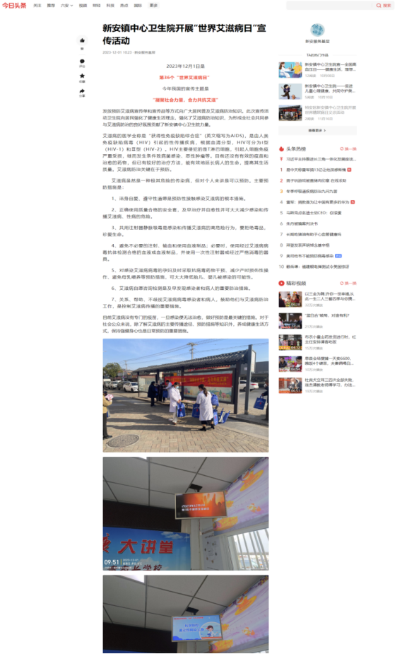 12月1日,我镇在新安镇街道举办"12.1 世界艾滋病日"宣传咨询义诊活动,第 36 个世界艾滋病日,今年宣传主题是“凝聚社会力量 合力共抗艾滋”。 2023年性病防治主题宣传周活动的主题是“防治性病、促进生殖健康。