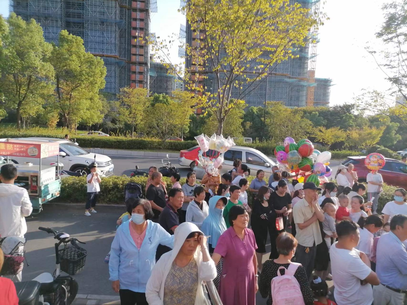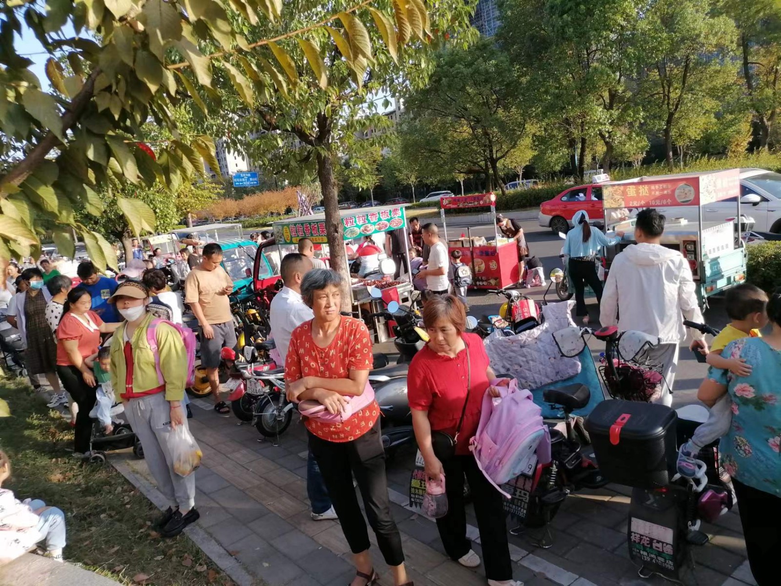振兴共和城幼儿园的大门,距离佛子岭路主路和其他幼儿园相比仅仅隔了一条辅路,辅路的一半是停车位,每天的放学时间,家长聚集接孩子,人员聚集非常密集。供家长和幼儿行走的空间非常至少。照片拍摄于2022年9月19日的下午五点。在此之前,曾经向12345拨打投诉过,14日拨打,16日依然很乱,且未见巡查人员。16号再次拨打电话之后,12345回复由裕安城南支队负责管理巡查,但是在周末结束之后的19号,依然出现摆摊乱象。