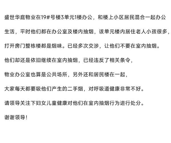 盛世华庭物业在室内抽烟,二手烟影响居民身体健康