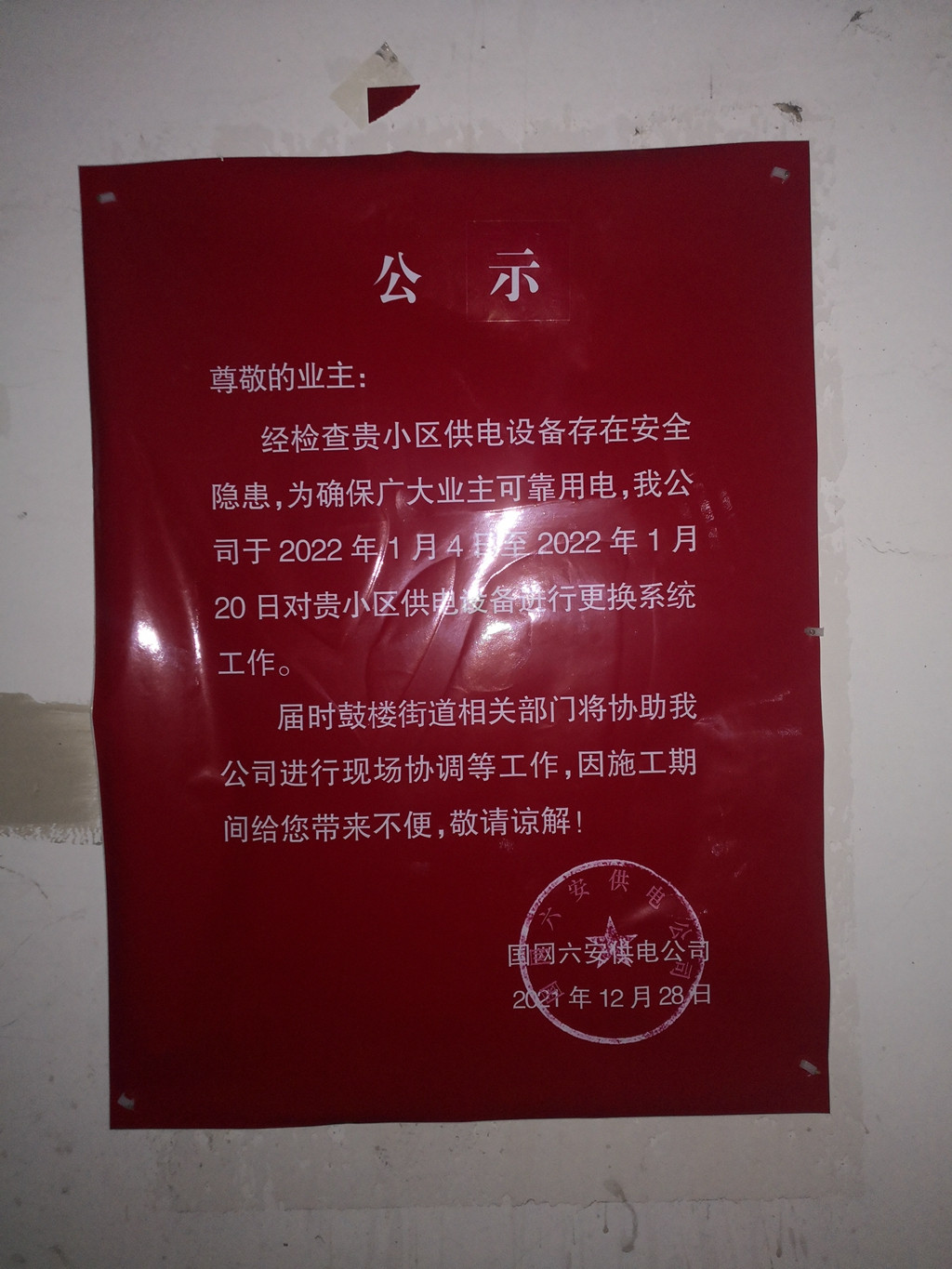 近日,国网六安供电公司在小区内张贴公告,称在小区“进行供电设备更换系统工作”,再次开挖上述被责令回填的基坑进行疑似增设变压器施工。