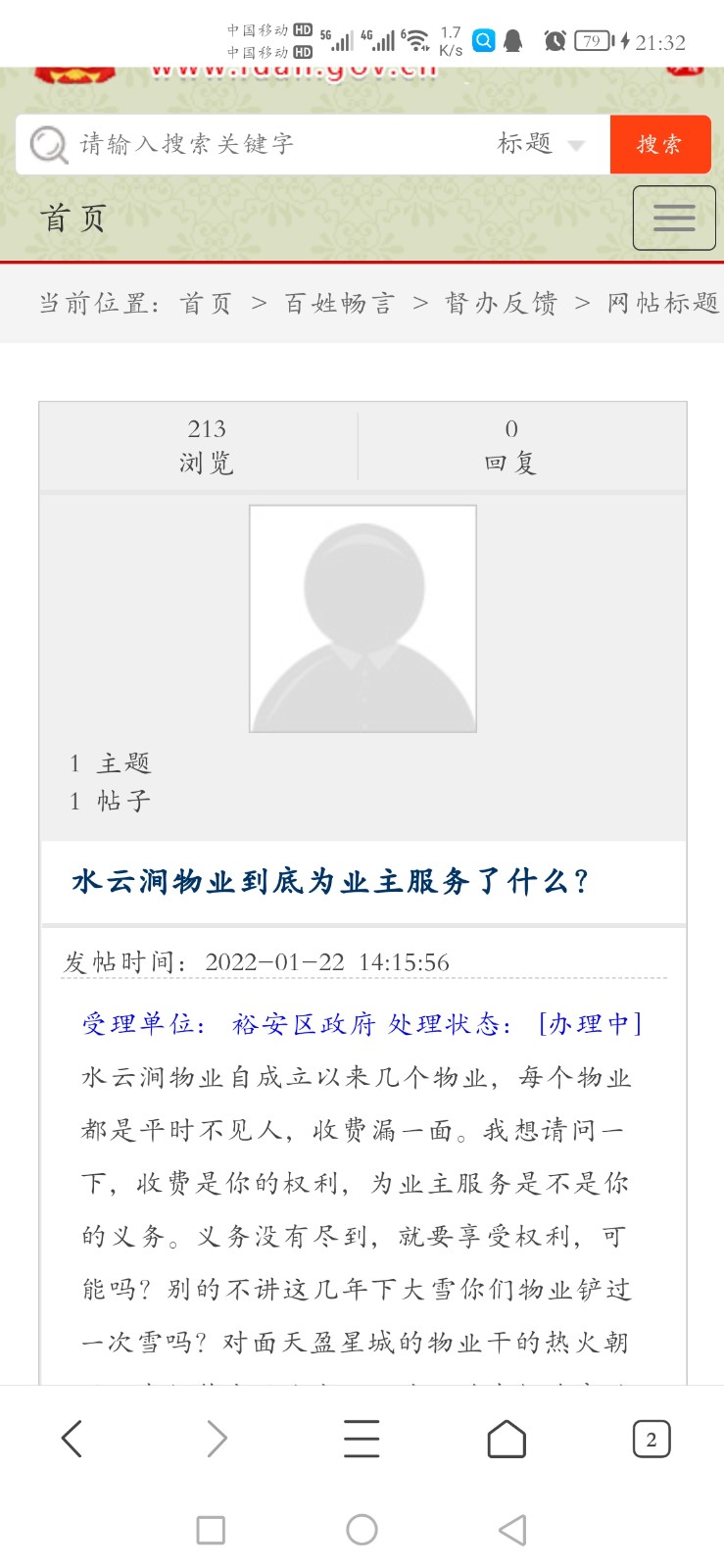 上一贴22号下午发出,不知道是分管物业公司的领导们太忙,还是管不了这些物业公司,如果管不了,那也请给个答复,我们业主的钱也是辛辛苦苦挣的,不能不明不白就把钱交了!听讲12年成立有业主委员会,我们没看到过更没听过这些人,更没有选过这些人,是内部选出来的,还是物业随便找几个人糊弄你们,我们不得而知!更希望分管物业公司的领导给个说法。物业公司是服务业主的不是威胁业主的,有服务才能有回报,没有服务谈和报酬!请领导们关注此事,也请领导搜索一下百姓畅言关于水云涧的问题。