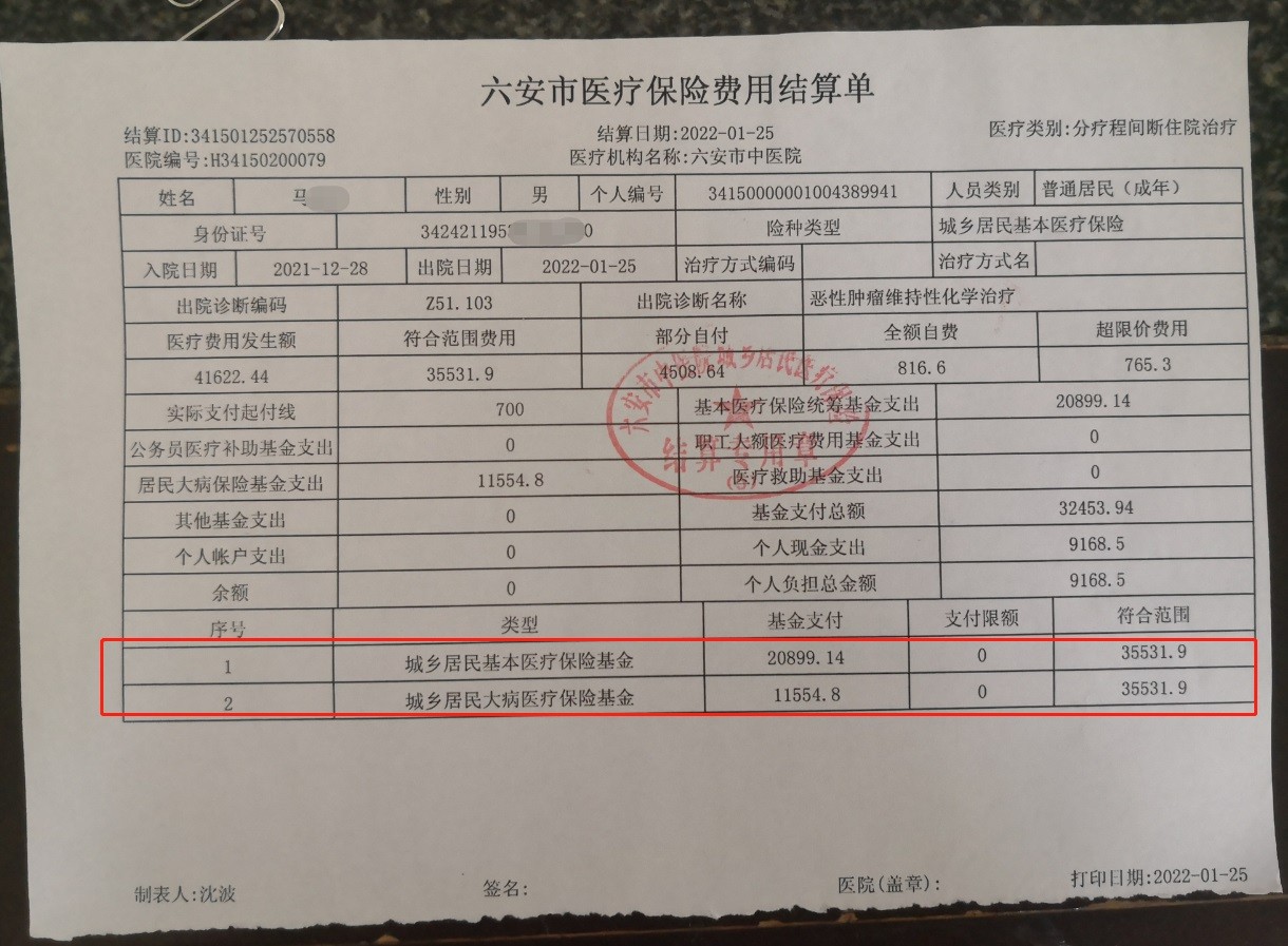您好,我家人因白血病,从2021年8月开始在市区医院分疗程间断住院治疗。最近的一次是2022年2月8号住院治疗。这一次治疗费用自付比例明显比前四次费用高,但是这一次住院天数、检查项目、用药种类比上一次少,用药天数也减少(住院费用清单可查)。治疗自费金额反而多了一倍,很不理解。“医疗保险费用结算单”显示这一次化疗没有了“城乡居民大病医疗保险基金”,这是为何?