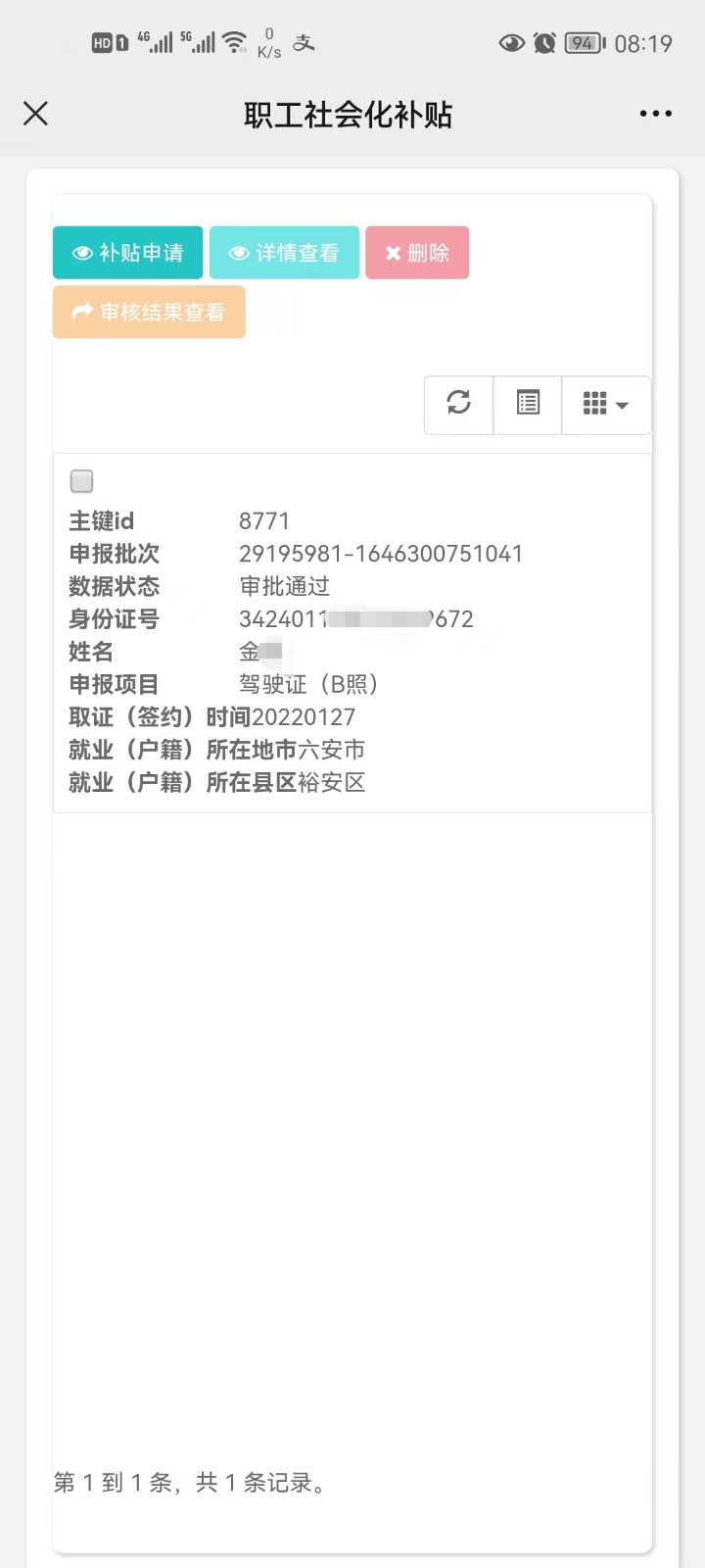 您在今年3月3日在网申请的B2驾驶证补贴已审核,因4月疫情没有发放,目前已审批完成,正在打卡发放。感谢您对我们工作的支持和理解!如有不清楚的地方,请联系裕安区就业管理服务中心,电话:0564-3235576。