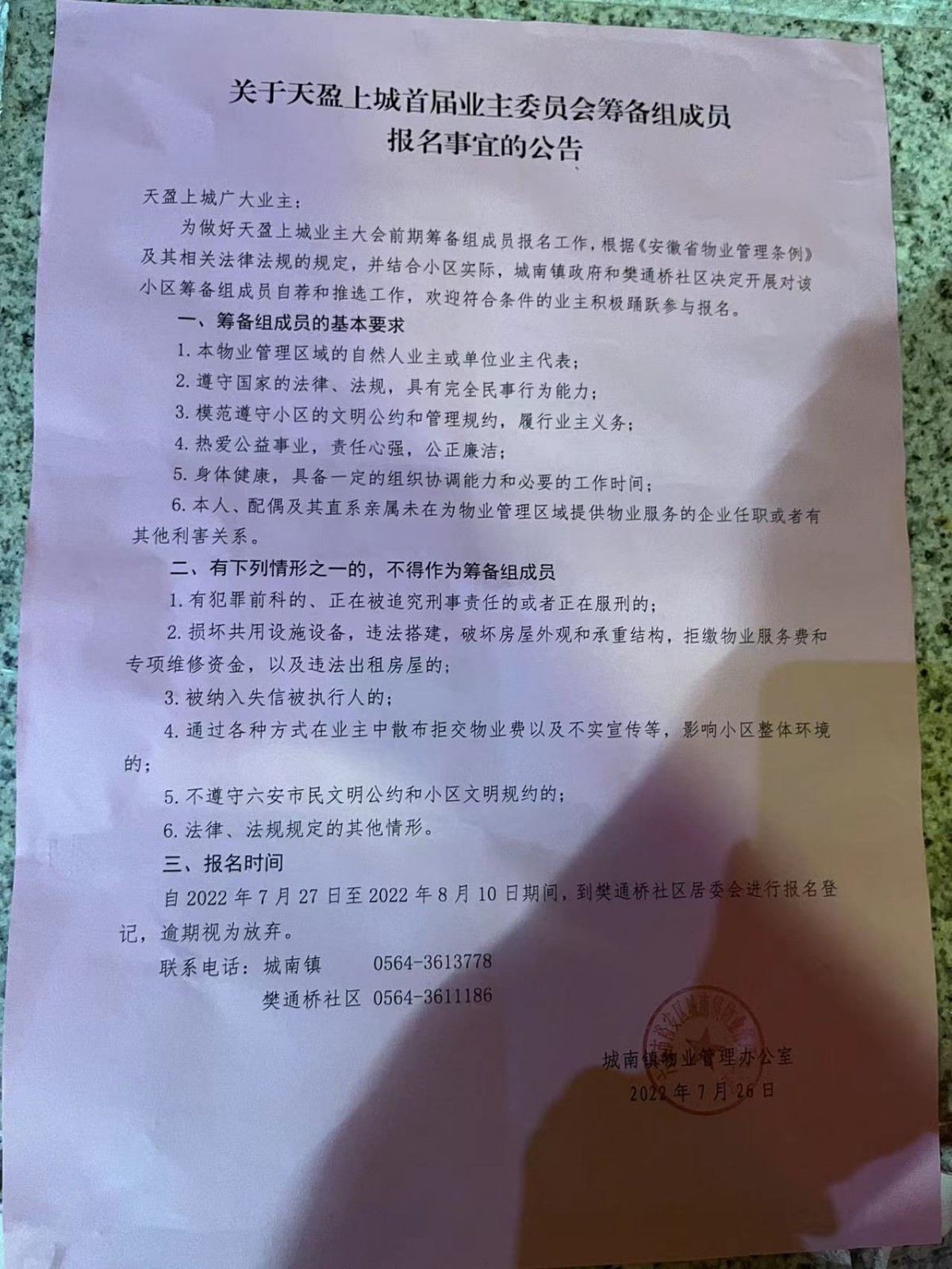 我是城南镇天盈上城小区号召召开业主大会的倡导人。今天城南镇政府物业办下发公告,业主大会一事终有眉目。但是从公告的题目到内容,不免费解和担忧。