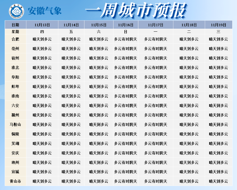 安徽省气象台预计,未来一周全省以多云到晴天为主,仅12日江南南部局部有小雨。