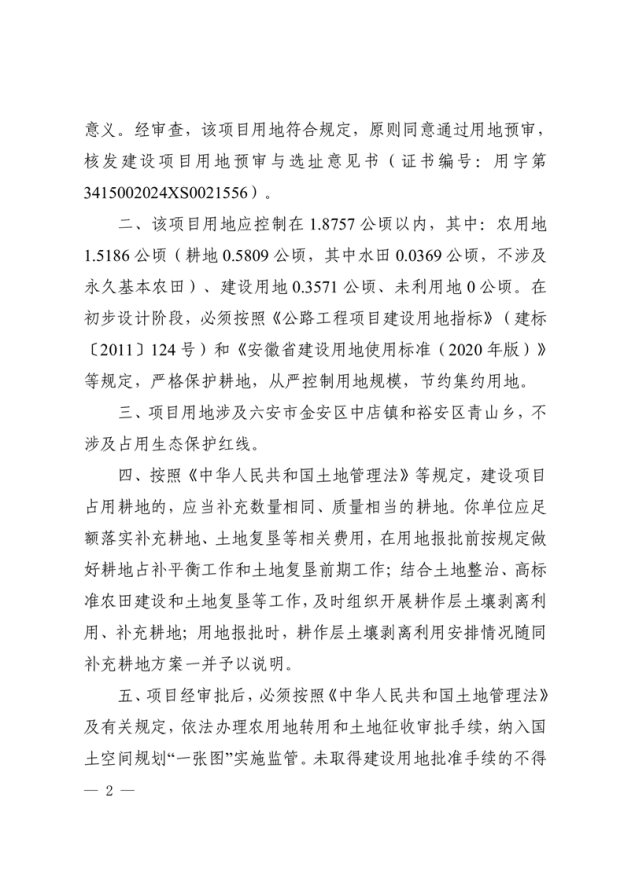 六安市自然资源和规划局关于S330八字岗段改造工程项目用地预审与规划选址的复函