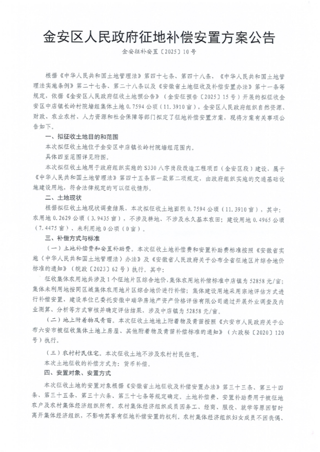 S330八字岗段改造工程征地补偿安置方案公告(金安区)