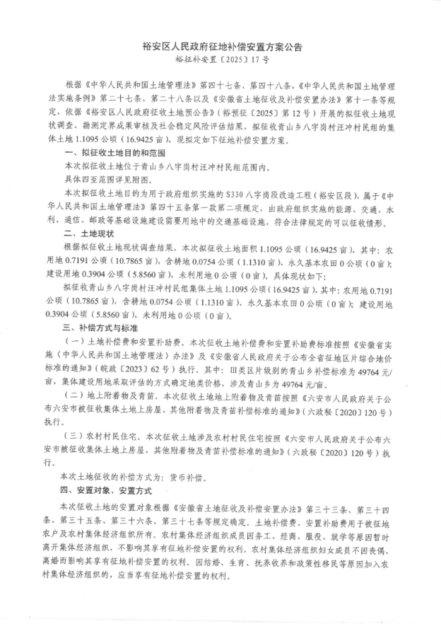 S330八字岗段改造工程征地补偿安置方案公告(裕安区)