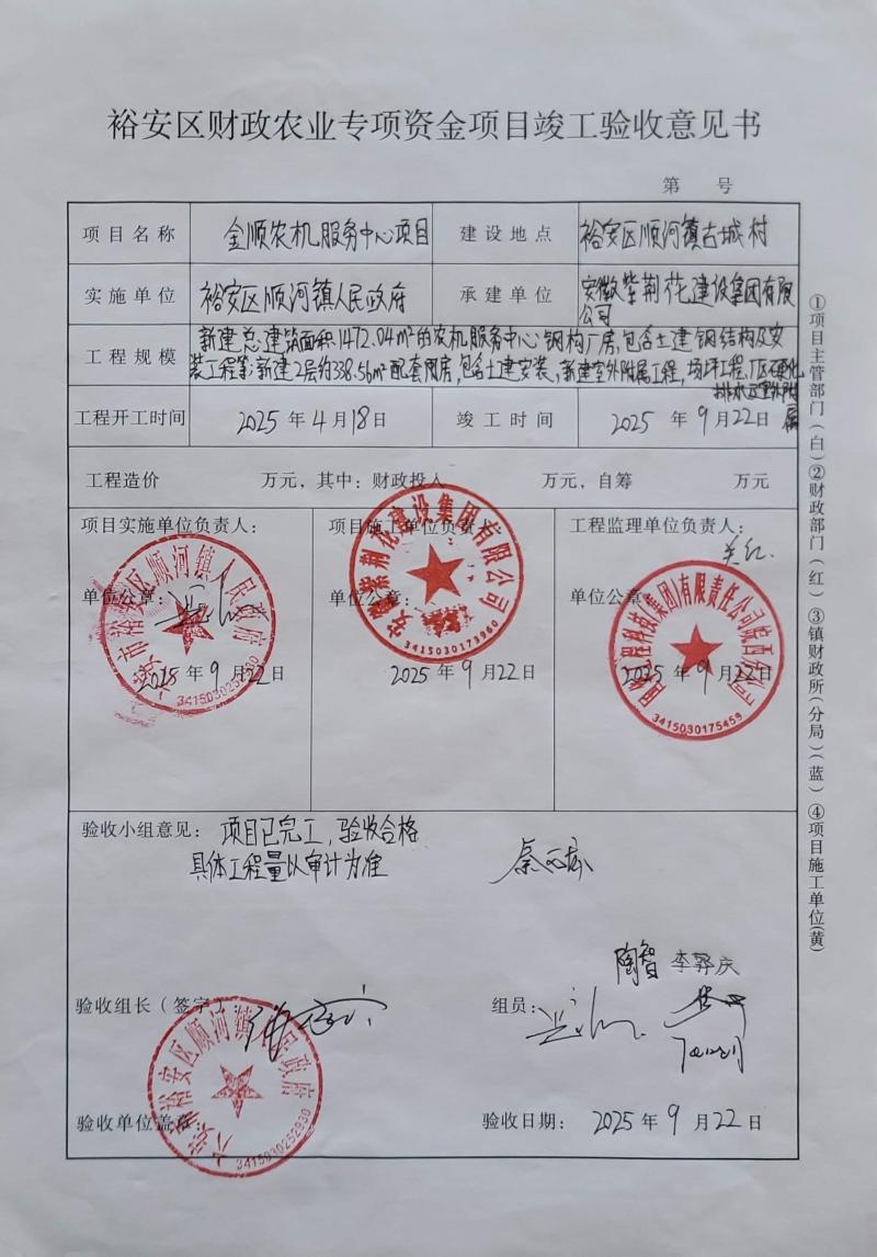 顺河镇金顺农机服务中心项目工程竣工验收意见书