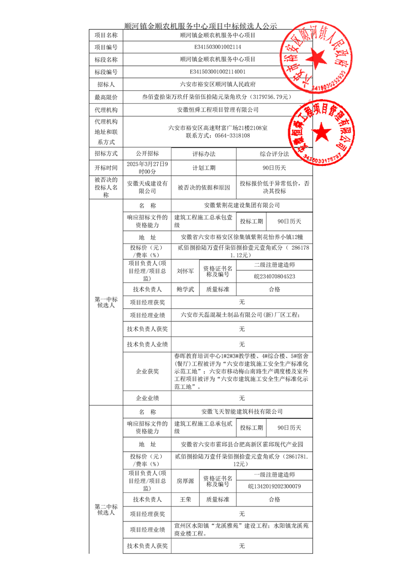 顺河镇金顺农机服务中心项目中标候选人公示