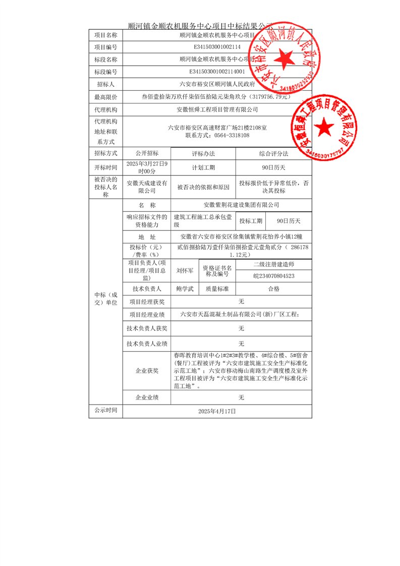 顺河镇金顺农机服务中心项目中标结果公示