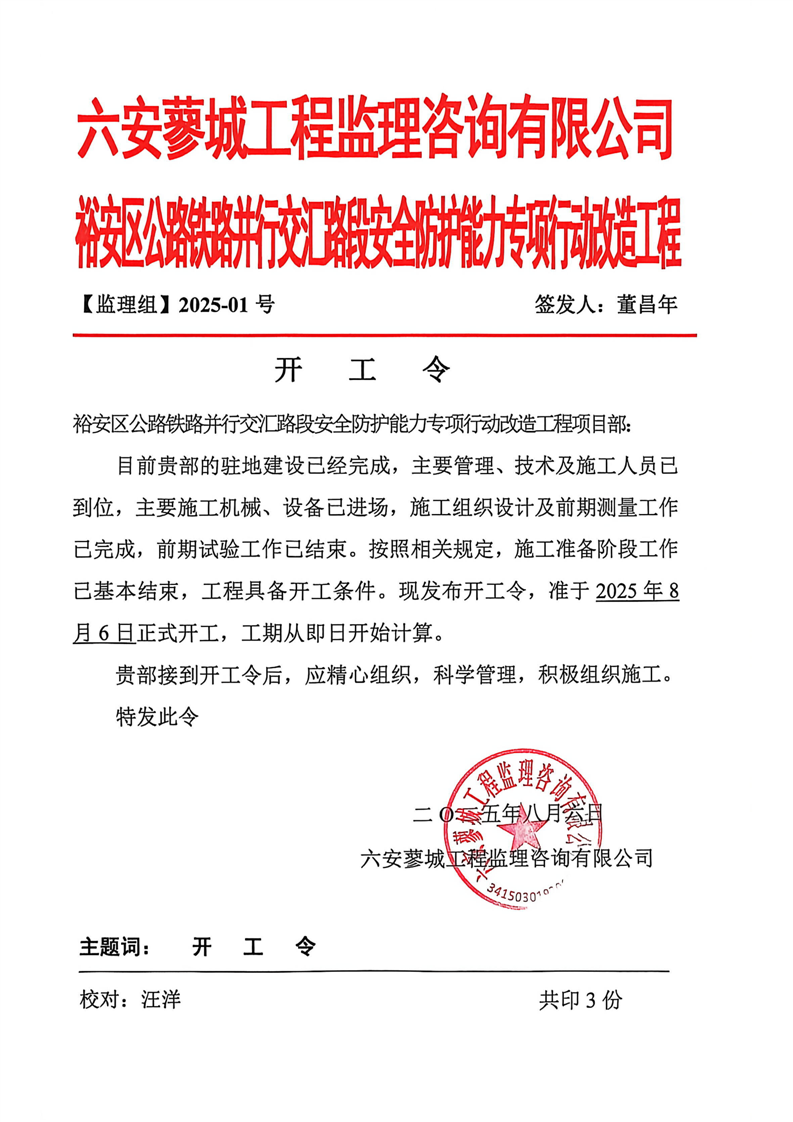 裕安区公路铁路并行交汇路段安全防护能力专项行动改造工程开工令