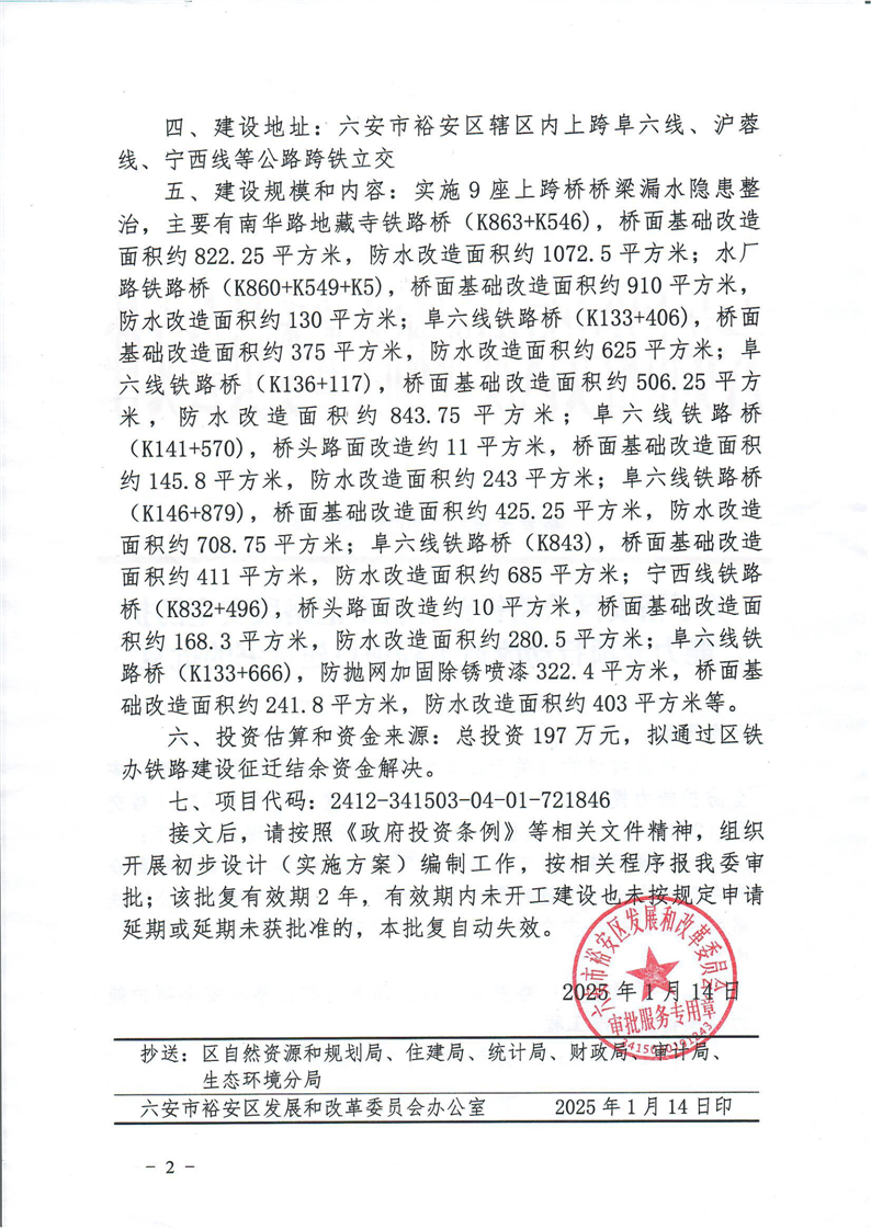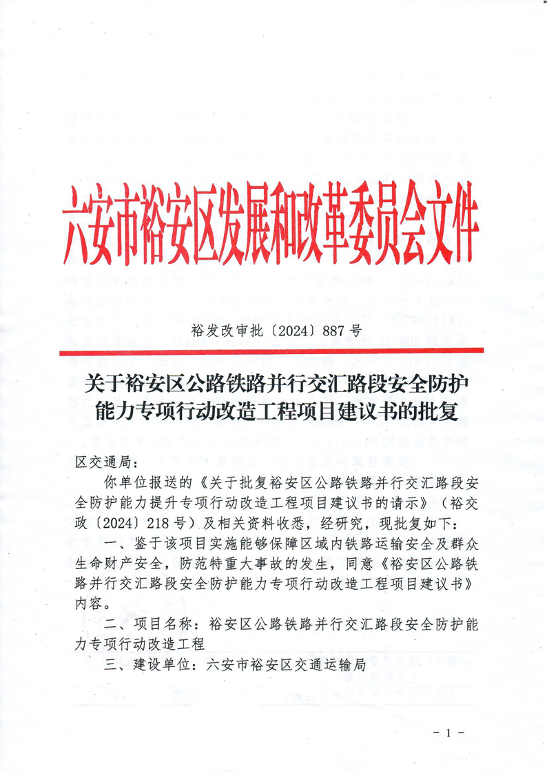裕安区公路铁路并行交汇路段安全防护能力专项行动改造工程项目建议书的批复