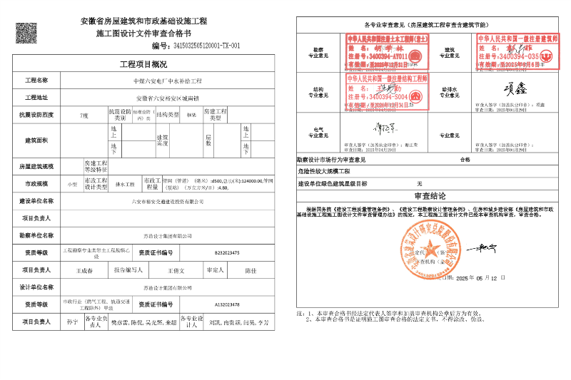中煤六安电厂中水补给工程施工图设计文件审查合格书