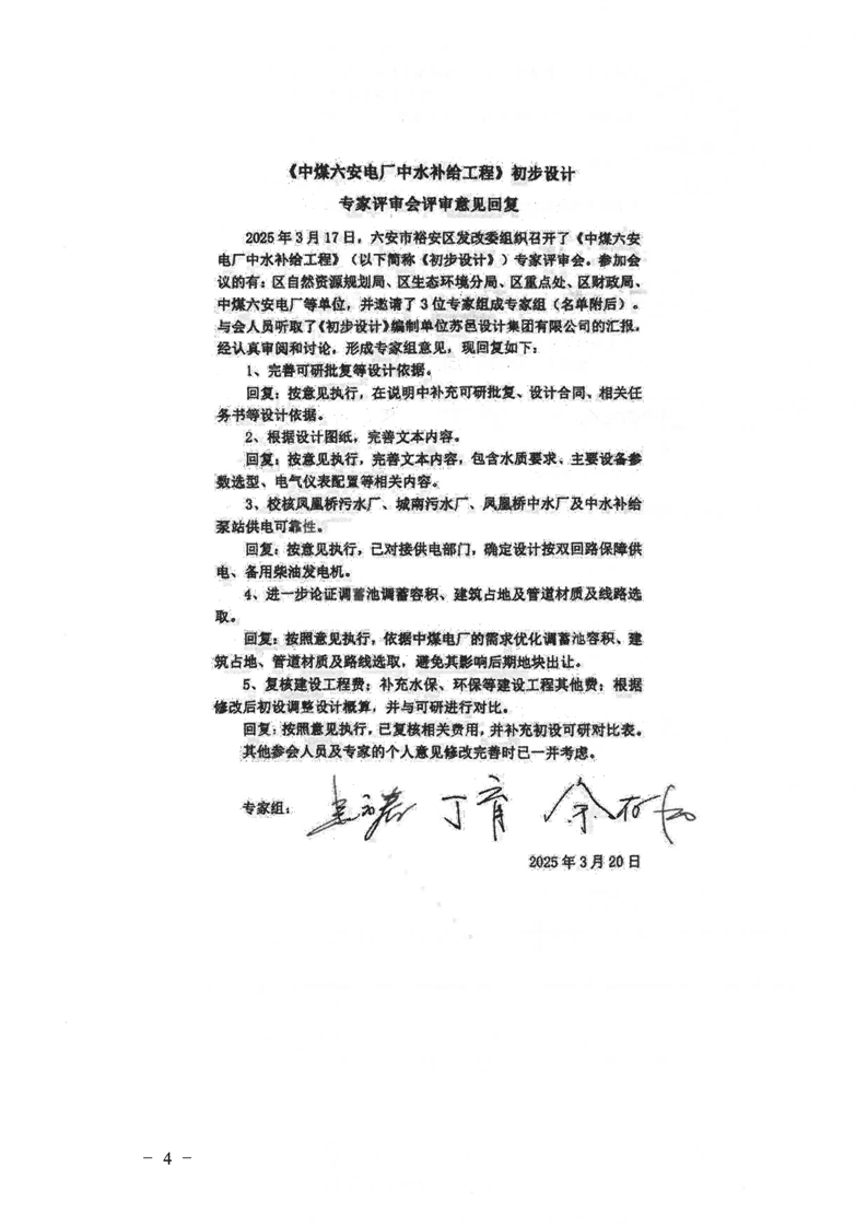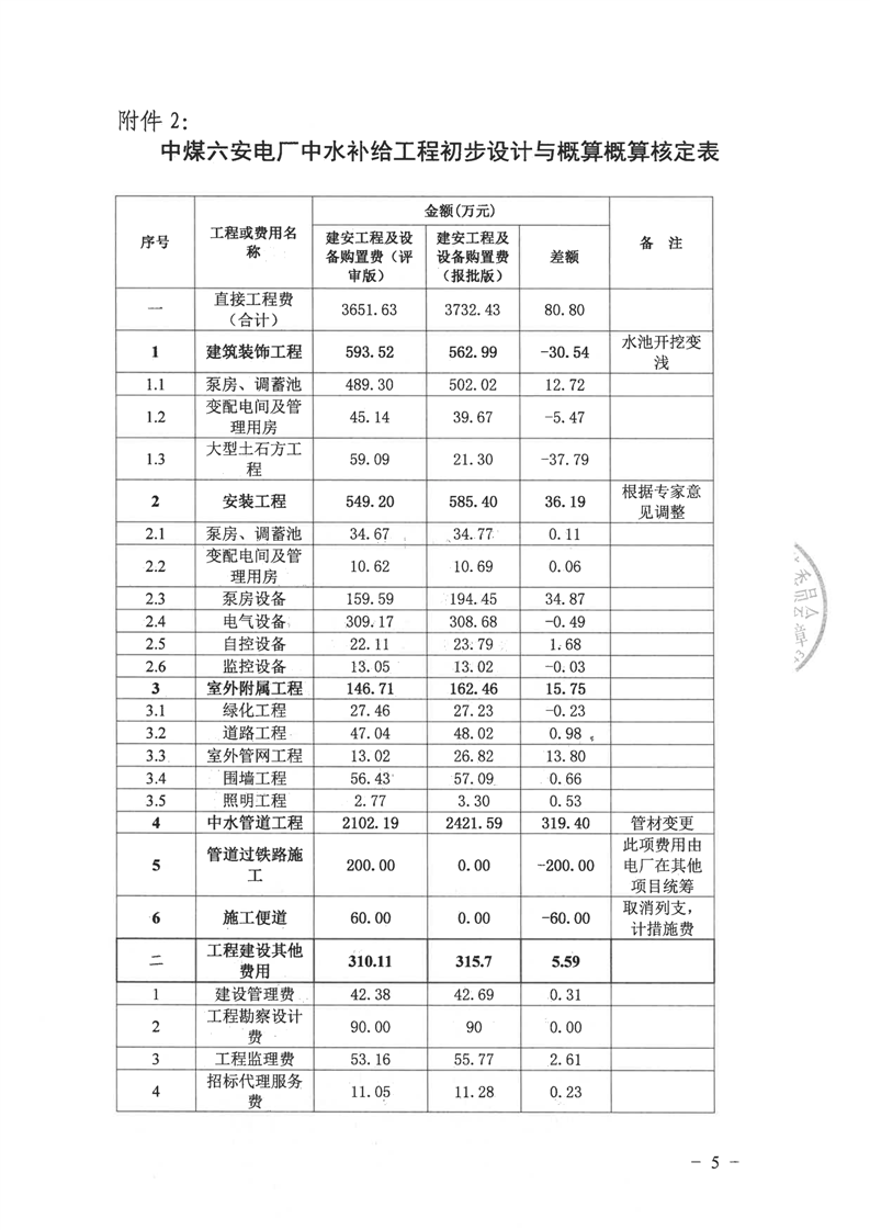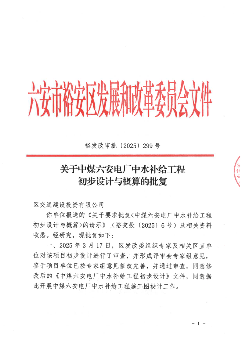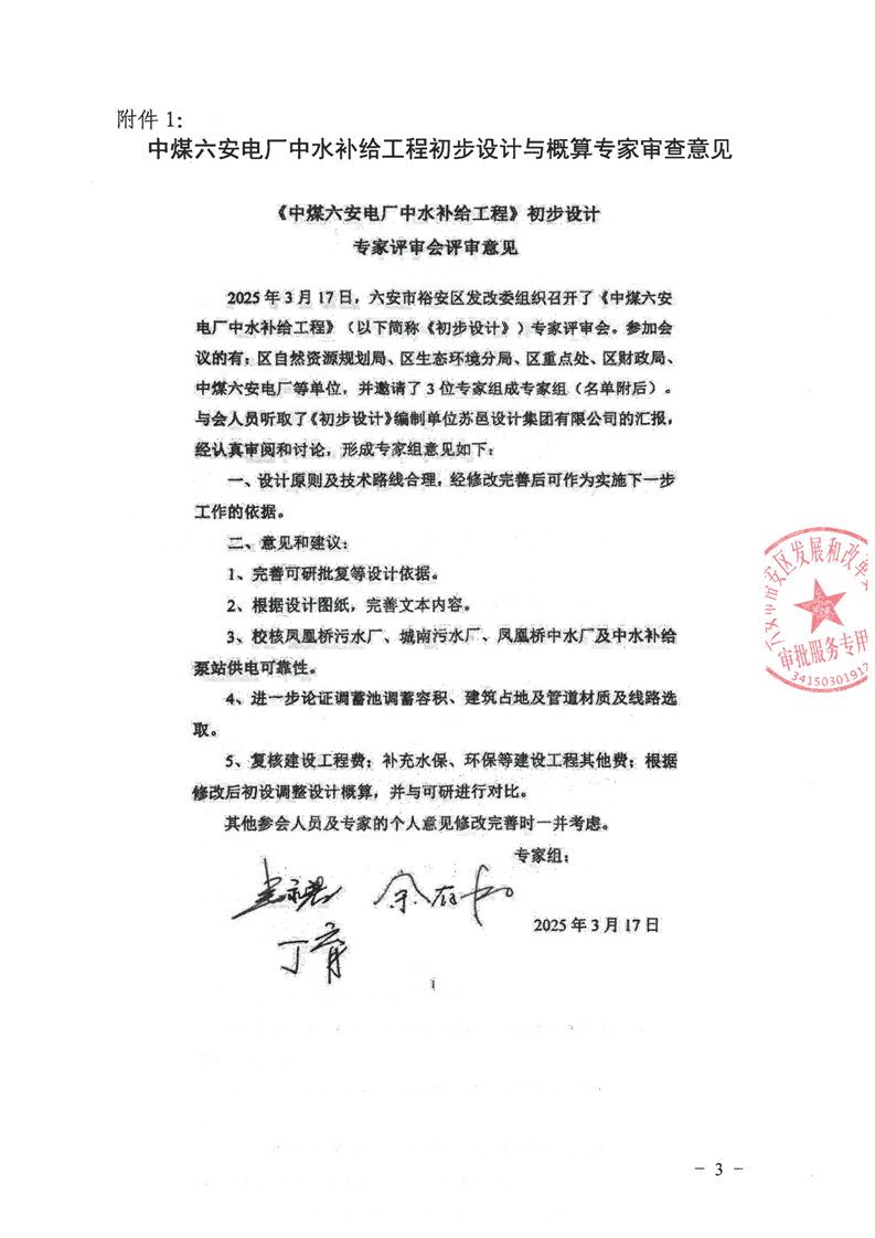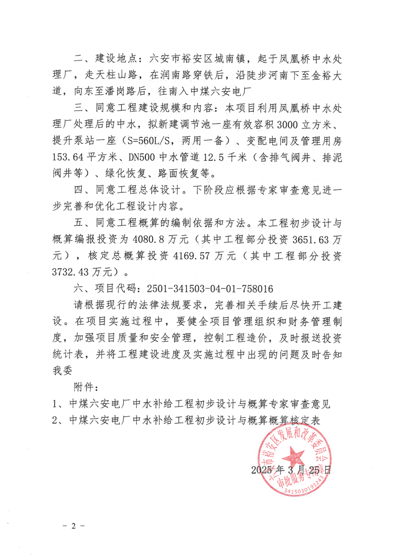 中煤六安电厂中水补给工程初步设计与概算的批复